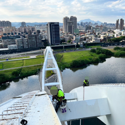 橋梁鋼構除鏽、底漆與面漆三道塗裝程序。